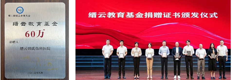 百年大计,教育为本。一向以来,缙云县委、县政府高度重视教育事业发展。2023年4月27日,在第二届缙云乡贤大会上,县委、县政府正式启动缙云教育基金。缙云教育基金主要用于扶助困难家庭的教师和学生;激励教师专业成长,奖励优秀学子;改善学校办学条件。2023年9月27日,缙云田氏伤科医积极响应缙云县委、县政府号召,履行社会职责,向缙云教育基金捐资60万元,为缙云教育事业添砖加瓦。